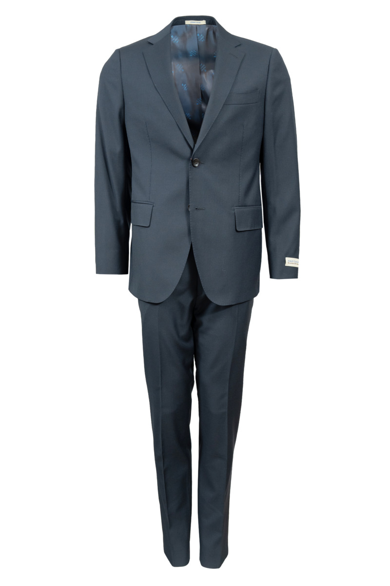 • Классический мужской костюм приталенного силуэта из шерстяной итальянской ткани с добавлением лайкры. При пошиве пиджака использован метод «Half Canvas». Этот способ имеет частичную прошивку: прошивается одна половина передней полочки от линии плеча. Не используются клеевые материалы, как при дешевой технологии пошив. Фундаментом служит подстежка (floating), которая делается из шерсти верблюда или более жесткого и, вместе с тем, более популярного конского волоса. Она, словно фундамент, является основой для передней полочки и закрепляет отвороты лацканов. Благодаря этому пиджак долго сохраняет форму и не вытягивается. Пиджак однобортный, две шлицы. Застежка на две пуговицы. Воротник классический, отложной, на лацкане имеется фасонная петля. Край лацкана, воротник, клапаны карманов декорированы отделочной строчкой «вспушка» (имитация ручного стежка). Два боковых кармана с клапанами, нагрудный карман «листочка». Рукава со шлицами на 4 пуговицы пришитые внахлест. Четыре внутренних кармана, один застегивается на пуговицу. Брюки прилегающего силуэта, два боковых кармана, два задних кармана с застежкой на пуговицу, на поясе предусмотрены шлевки для ремня. Подкладка: 100 % вискоза. Отличный вариант на каждый день.