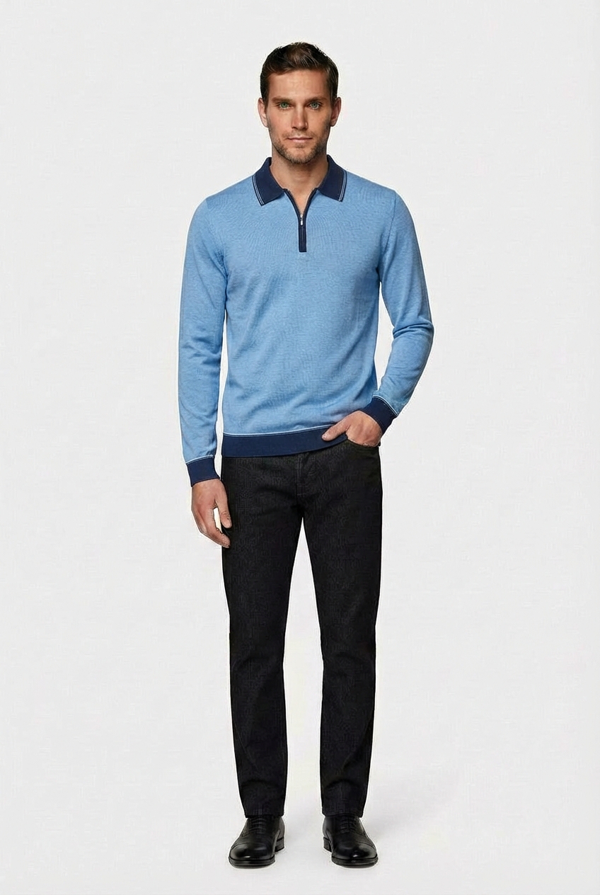 • Джемпер-поло CAIOMARIO полуприлегающего силуэта из высококачественной шерсти мериноса «Merino wool» с добавлением акрила и п/э. «Merino wool» это тонкая, мягкая и очень качественная шерсть. Она ценится за свои уникальные свойства, такие как превосходная терморегуляция (сохраняет тепло в холод и прохладу в жару), гигроскопичность (хорошо впитывает влагу, но быстро сохнет) и приятная на ощупь мягкость, благодаря которой она не «колется». Воротник отложной. Застежка на короткую молнию. Низ изделия и рукавов на резинке. Прекрасно сочетается с джинсами и брюками . Стильная и элегантная вещь отлично подойдет для повседневной носки. Выбирайте качество, выбирайте стиль, выбирайте CAIOMARIO!